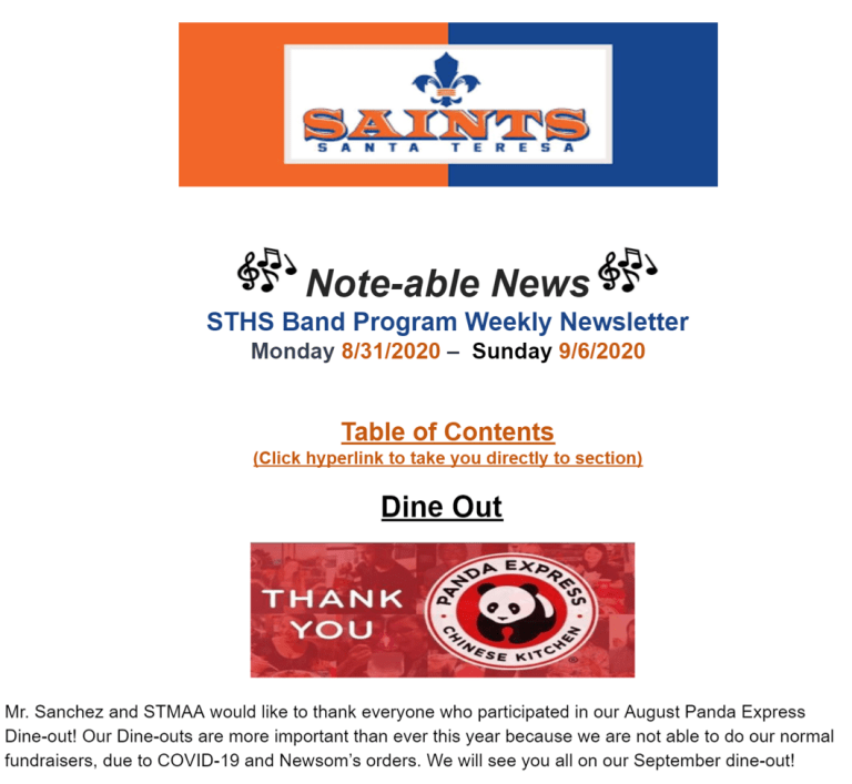 Weekly Newsletter – 8/30/2020 August 30, 2020Santa Teresa Music Click on Note-able News for this week’s Newsletter