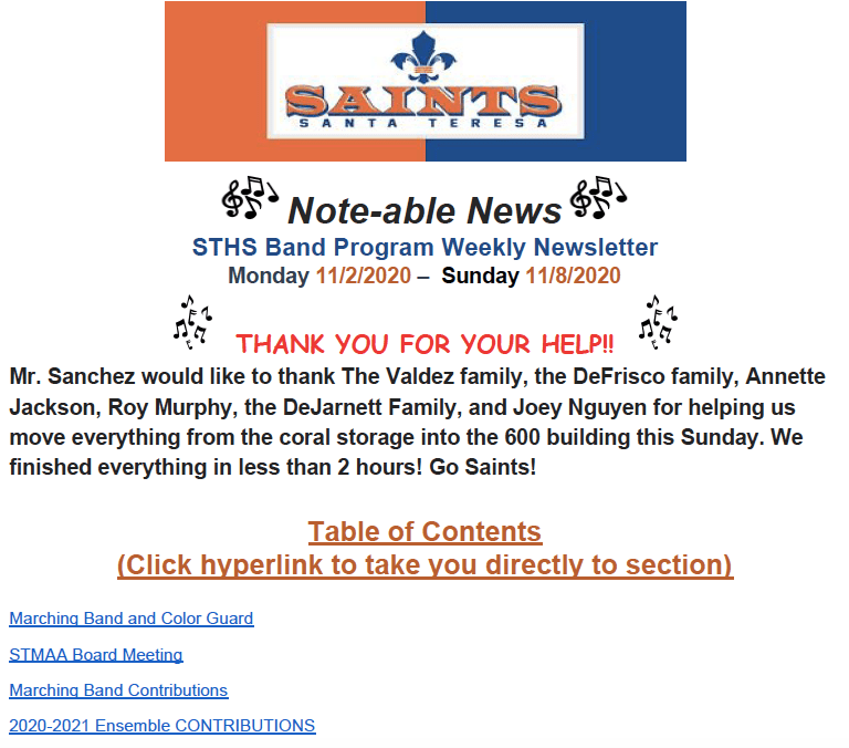 Weekly Newsletter – 11/01/2020 November 1, 2020Santa Teresa Music Click on Note-able News for this week’s Newsletter