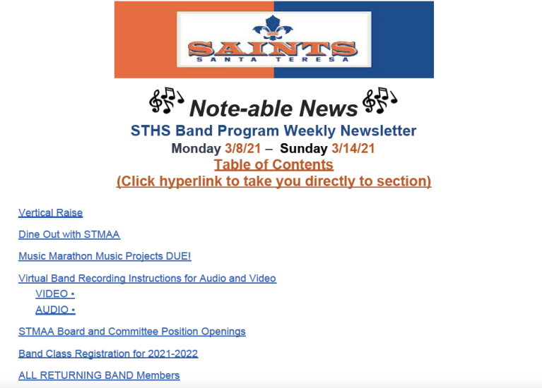 Weekly Newsletter – 3/7/2021 March 7, 2021Santa Teresa Music Click on Note-able News for this week’s Newsletter
