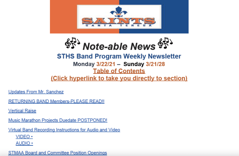 Weekly Newsletter – 3/21/2021 March 21, 2021Santa Teresa Music Click on Note-able News for this week’s Newsletter