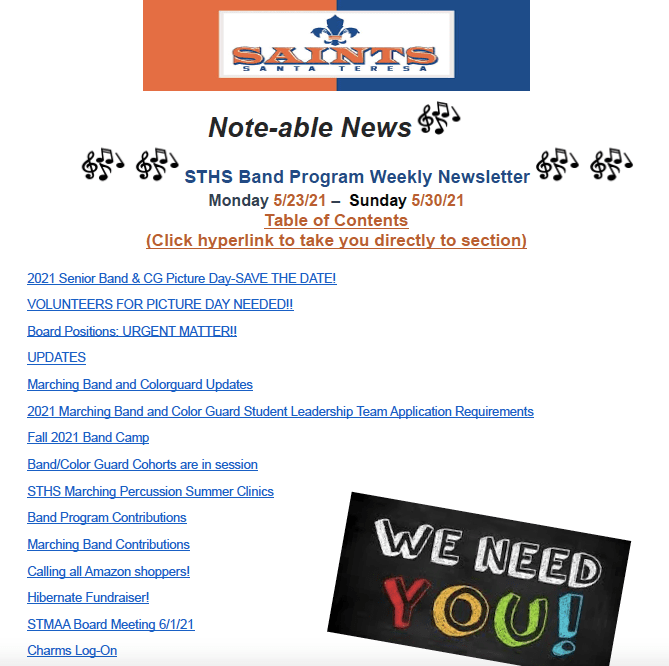 Weekly Newsletter – 5/23/2021 May 23, 2021Santa Teresa Music Click on Note-able News for this week’s Newsletter