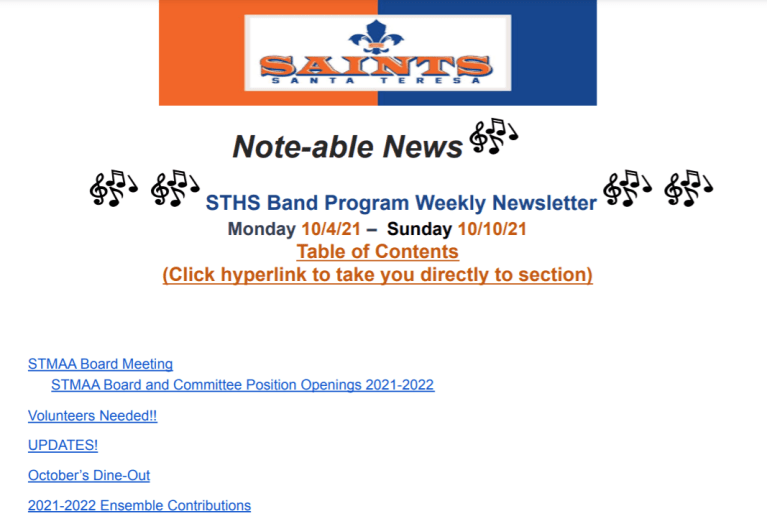 Weekly Newsletter – 10/4/2021 October 4, 2021Santa Teresa Music Click on Note-able News for this week’s Newsletter