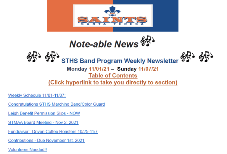 Weekly Newsletter – 11/1/2021 November 1, 2021November 1, 2021Santa Teresa Music Click on Note-able News for this week’s Newsletter
