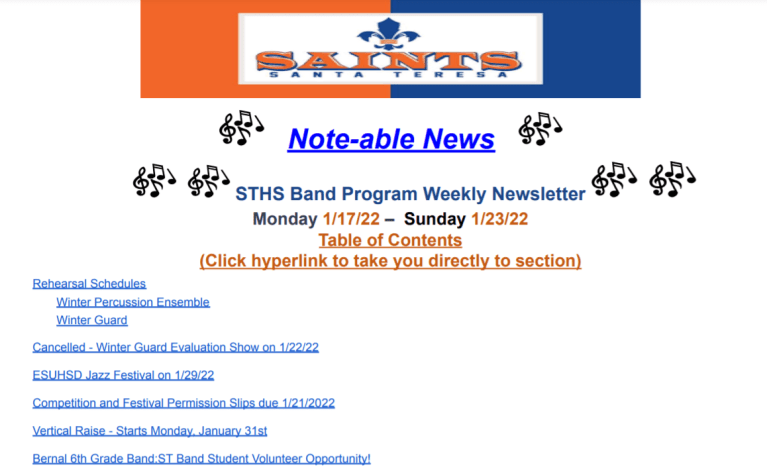 Weekly Newsletter – 1/10/2022 January 16, 2022Santa Teresa Music Click on Note-able News for this week’s Newsletter