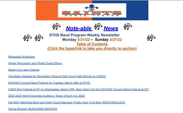 Weekly Newsletter – 3/22/2022 March 22, 2022Santa Teresa Music Click on Note-able News for this week’s Newsletter