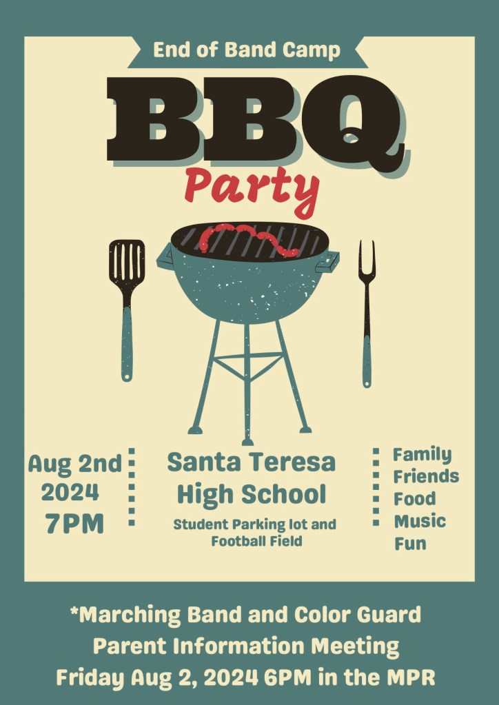 Join us for a Parent Information Meeting on Friday, 8/2, at 6pm in the MPR. Then stay for the end of band camp BBQ! RSVP for the BBQ at https://forms.gle/ZbP5Tt72F99TWGVG8