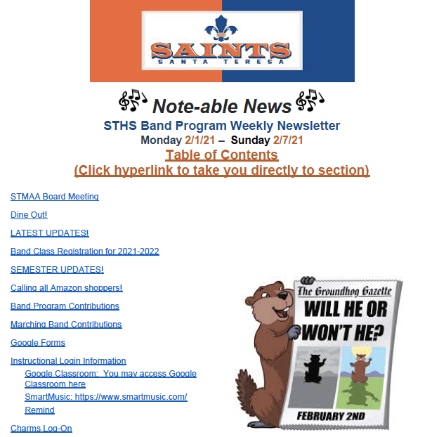 Weekly Newsletter – 1/31/2021 January 31, 2021January 31, 2021Santa Teresa Music Click on Note-able News for this week’s Newsletter