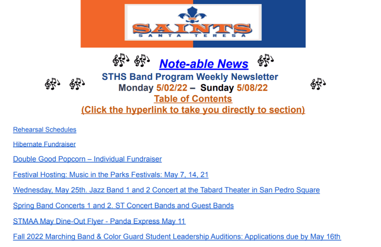 Weekly Newsletter – 5/05/2022 May 5, 2022May 5, 2022Santa Teresa Music Click on Note-able News for this week’s Newsletter