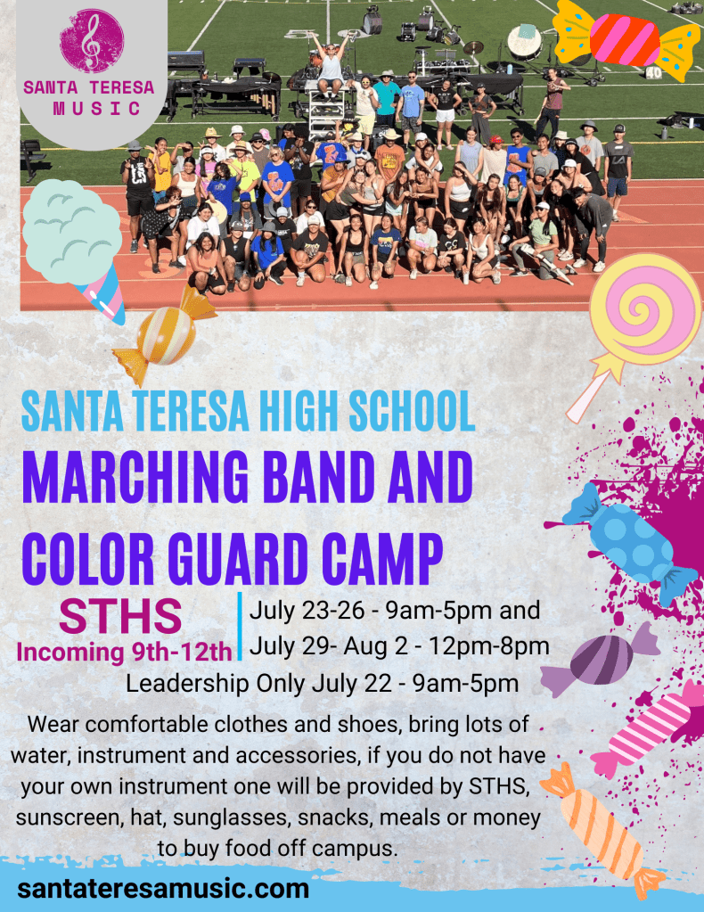 Join us for Marching Band and Color Guard camp for the 2024-2025 school year, starting Tuesday, July 23, at 9am at the STHS Band Room (room 602). Contact Mr. Crisanto at banddirector@santateresamusic.com to sign up. Learn more about Marching Band and Color Guard
