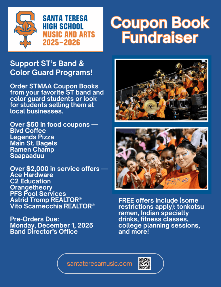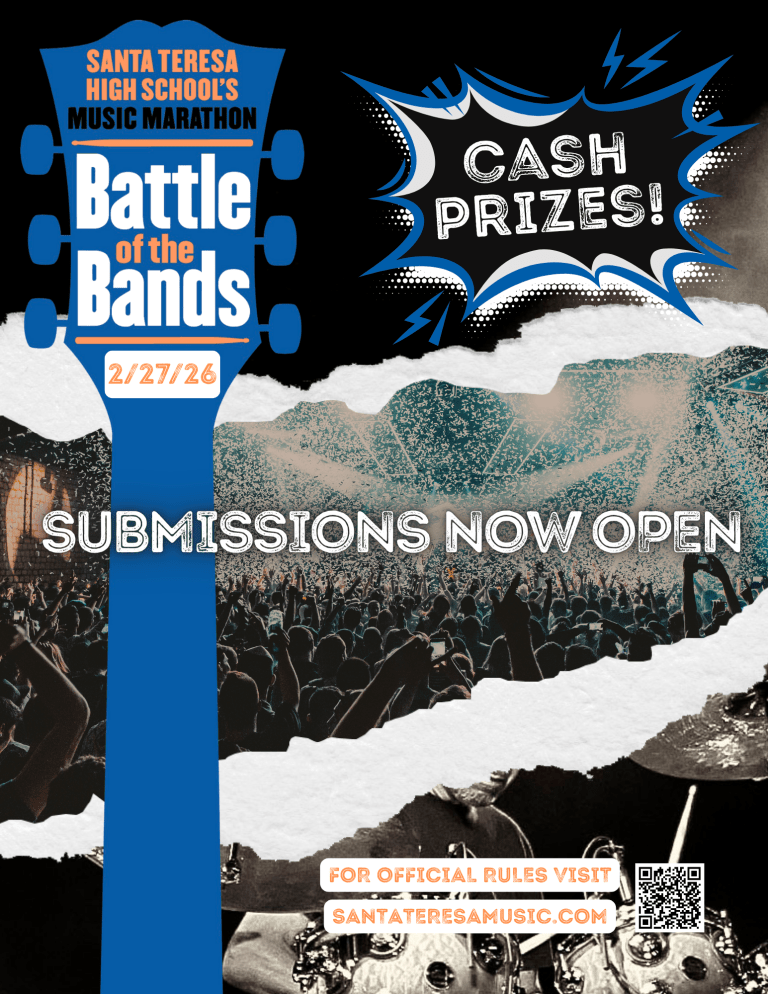 STHS’s Battle of the Bands is back! Showcase your band on stage for CA$H PRIZES and GLORY during Music Marathon on Friday evening, February 27, 2026. Sign up details and official rules: https://santateresamusic.com/battle-of-bands/